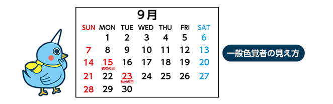 その中で、濃い赤が暗く黒っぽい色に見えるという人たちがいるんだけど、カレンダーって、平日の数字は「黒」、土曜日は「青」日曜・祝日は「赤」で作られていることが多いよね。