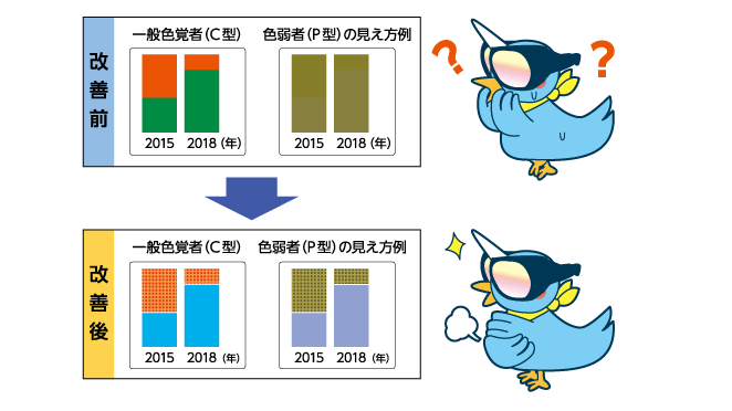 一般色覚者の人にはわかりやすい配色でも、色弱者の人には、全然見分けがつかない色になってしまうことがあるんだね。